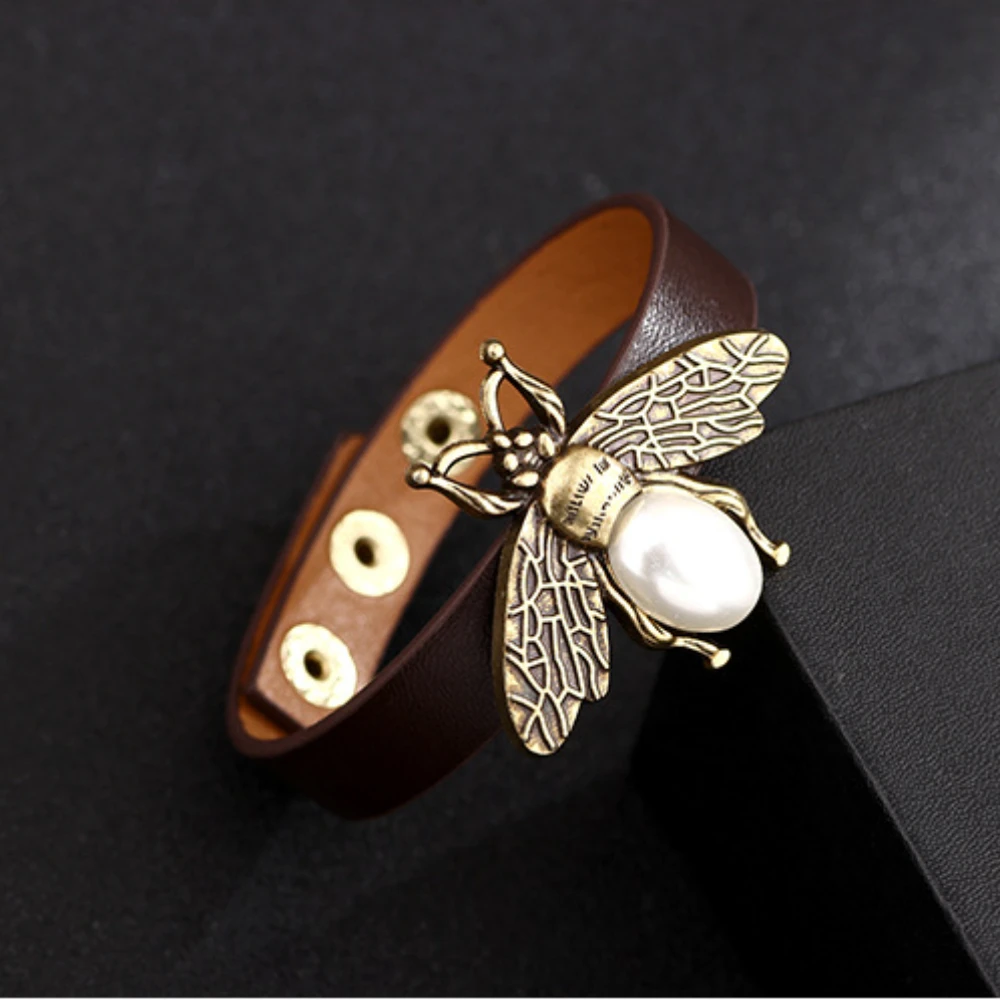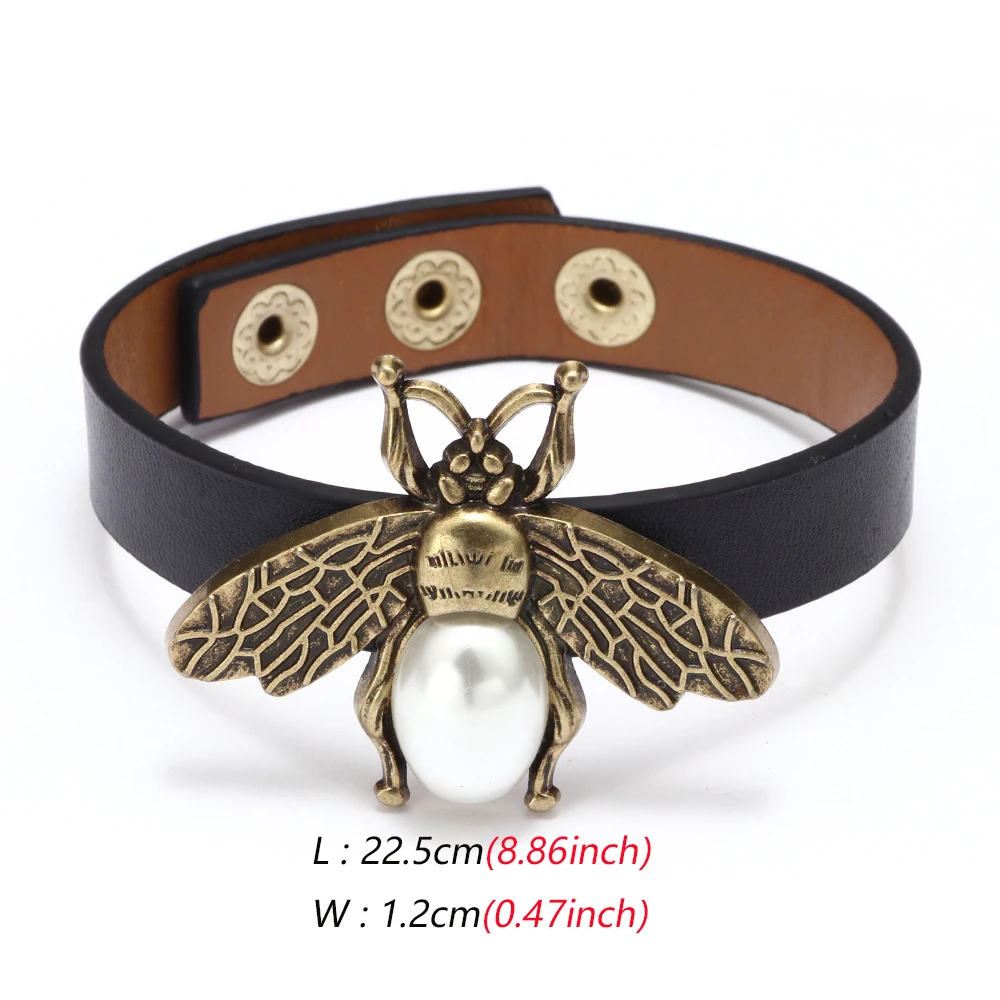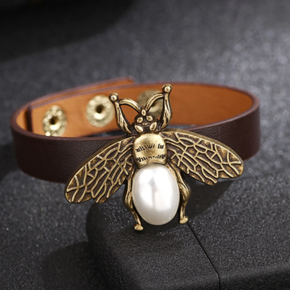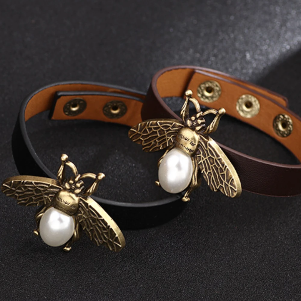 Vintage Bee Pearl Charms Bangles Bracelets for Women Men Simple Adjustable Leather Insect Bangle Bracelet Trendy Jewelry Gifts
